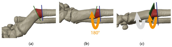 Simulation of surgical steps of the flipping-wedge osteotomy on the 3D model obtained from the CT scan with the radius at the plane of maximal angulation: (a) one cut is made along the transverse bisector line (green plane) and the other perpendicular to the longitudinal axis of the proximal bone (blue plane); (b) the bone wedge within cuts (red) is then flipped 180° on the longitudinal axis (orange arrow); and (c) further correction of the rotational deformity is achieved by rotating all segments distal to the blue plane (gray and orange arrows).