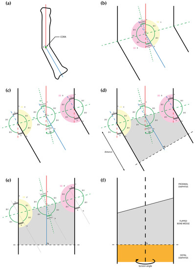 These considerations are defined in two dimensions, but they can be contextualized in a three-dimensional system to plan the bone correction by applying them on the plane of maximal deformity in which the deformity reaches the highest magnitude [14]. The axes and the CORA were identified according to the previous reasoning (Figure 3a,b). Idealizing the bone as a rectangle with sides parallel to the axes, we can again apply the corresponding angles theorem, obtaining the corresponding angles, as shown in Figure 3c. Cutting along the tBL will correct the deformity, while the second cut of the bone wedge needs to be perpendicular to one of the axes, at any distance preferred by the surgeon, because it does not affect the correction (Figure 3d,e).