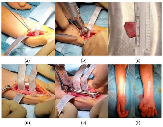 Steps of the surgical procedure: (a) according to preoperative planning, through a volar approach, two K-wires were positioned along the plane of maximal deformity from the concave side of the bone deformity; (b) guided by K-wires, two cuts perpendicular to the plane of maximal deformity were performed; (c) the desired bone wedge was obtained; (d) the bone wedge was flipped 180° on the longitudinal axis of the radius and used as an intercalary autograft for the osteotomy; (e) a locking-compression T-plate was implanted for fixation; and (f) the alignment of the forearm appeared acceptable at the end of the procedure.