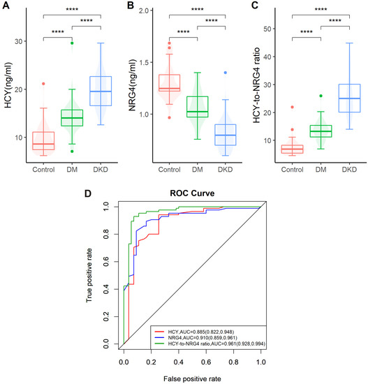 Comparison of NRG4, HCY and HCY/NRG4 between groups and their predictive efficacy. (A) Comparison of HCY among the control group, the DM group and the DKDs; (B) Comparison of NRG4 among the control group, the DM group and the DKDs; (C) Comparison of HCY/NRG4 among the control group, the DM group and the DKDs; (D) The predictive efficacy of NRG4, HCY and HCY/NRG4 in DKD. **** p < 0.01.