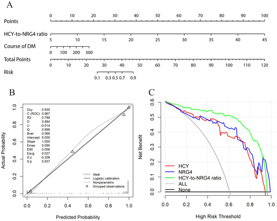 Evaluation of DKD rates associated nomograms, the calibration curves and decision curve analysis for patients with DM. (A) The nomogram integrating the HCY/NRG4 and course of DM for predicting the risk of DKD; (B) The calibration curve for predicting patients’ risk of DKD; (C) Decision curve analysis of the nomogram for the risk of DKD.