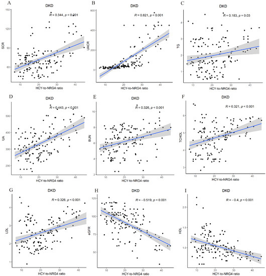 Pearson correlation analysis showed that HCY/NRG4 was positively correlated with Scr, UACR, TG, UA, BUN, TCHOL and LDL (p < 0.05), negatively correlated with eGFR and HDL (p < 0.05 or p < 0.01) (Figure 3).
