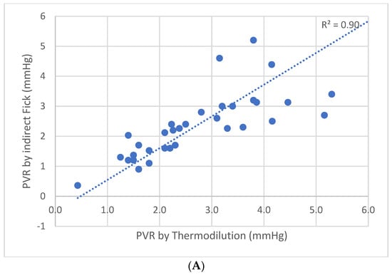 (A) PVR using indirect Fick method plotted against PVR using thermodilution method in patients with mean PA pressure > 20 mmHg. (B) PVR using indirect Fick method plotted against PVR using thermodilution method in patients with mean PA pressure ≤ 20 mmHg. p = 0.004. PVR—pulmonary vascular resistance.