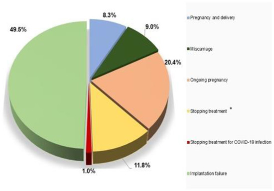 Percentages of obstetric and pregnancy outcomes after ART in women investigated. * Stopping treatment indicates that ART treatment was stopped for one of these reasons: under stimulation, over stimulation, no or low fertilization, delayed or abnormal embryo development.