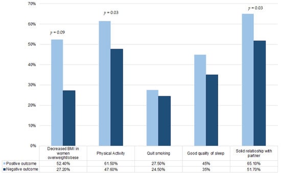 In Figure 2, we observed a higher percentage of women with overweight/obesity who reduced their body weight before ART procedure by enhancing BMI in the group of women with positive outcomes (52.4% vs. 27.2%, p = 0.09). In addition, in the preconception period, over 60% of women with positive outcomes practiced physical activity compared to the 47% observed in the group of women with negative outcomes (p = 0.03). Concerning smoking habits, women who obtained positive outcomes were more virtuous, and had a better quality of sleep (45% vs. 35%), as well as having more solid relationships with their partners (65.1% vs. 51.7%, p = 0.03).