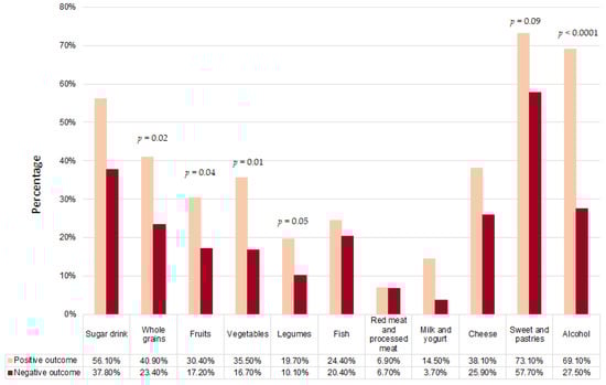 Concerning eating habits (Figure 3), women who increased their adherence to the Mediterranean pattern in their preconception period had more positive outcomes. In particular, in women with positive outcomes we observed an increase in the intake of whole grains (p = 0.02), fruits (p = 0.04), vegetables (p = 0.01), and legumes (p = 0.05), and a reduction in the consumption of sweets and sugar drinks, even if not significant. Before ART the alcohol consumption was low, according to the Mediterranean diet, in women with positive obstetric outcomes in comparison to women with negative outcomes (p < 0.0001).