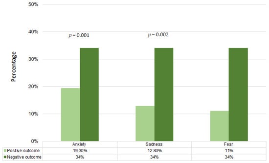 Finally, regarding emotional state (Figure 4), we observed that participants who experienced “very much” or “extreme” anxiety (p = 0.001), sadness (p = 0.002), and fear were clearly more numerous in group with negative pregnancy outcomes.