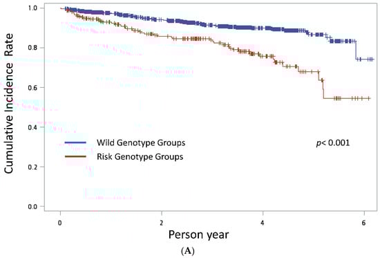 Next, we used the Kaplan–Meier method to measure the cumulative incidence of CRC (Figure 1). These results demonstrated that both the rs721673 risk genotypes AG/GG and rs721675 risk genotypes AT/TT were correlated with significantly higher CRC rates than the two wild genotypes (log-rank test p < 0.001 and p < 0.001, respectively). We further examined the association of HSD17B4 rs721673 and rs721675 with CRC by age, sex, BMI, smoking, alcohol consumption, betel nut-chewing habits, and CCI scores. The ORs for rs721673 and rs721675 were significantly higher in the alcohol consuming group than in the non-alcohol consuming group (aOR = 15.2, 95% CI = 3.91 to 58.8; aOR = 16.4, 95% CI = 3.33 to 83.3, respectively) (Table 2). However, other covariates did not influence the association between HSD17B4 rs721673/rs721675 and CRC.