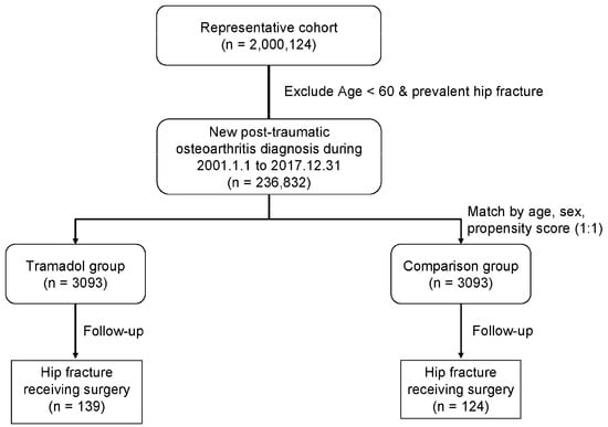 The patients with a diagnosis of posttraumatic osteoarthritis of any major joint of upper limbs or lower limbs after trauma (ICD-9-CM: 716.1; ICD-10: M12.50) for at least three times of outpatient department treatment or at least 1-time inpatient admission treatment, and a more-than-90-day within 1 year prescription for tramadol and the combinative drugs including tramadol (drug codes N02AJ13 and N02AX02) for pain control from 2001 to 2017, were enrolled as the tramadol cohort. The index date was the first date of prescription. The exclusion criteria were (1) tramadol prescription claims in 2000 (to ensure that patients were new users); (2) those who were younger than 60 years; (3) the diagnosis of a hip fracture before the index date; (4) those who received a regular steroids, sedative, hypnotic, or anticonvulsant prescription (more-than-90-day within 1 year prescription); and (5) those who were diagnosed as having a mental disorder. The patients who did not use tramadol but used any non-steroidal anti-inflammatory drugs, paracetamol, or muscle relaxants were matched with the patients in the tramadol cohort. These patients were enrolled using the same exclusion criteria as for those in the tramadol cohort and included as the control group for comparison. Propensity score matching at a 1:1 ratio was performed for age; sex; index year; and comorbidities, including hypertension, diabetes mellitus, hyperlipidemia, coronary artery disease, cerebral vascular accident, chronic liver disease, chronic renal failure, depression, and osteoporosis. (Figure 1). The comorbidities included diabetes mellitus, hypertension, coronary artery disease, hyperlipidemia, chronic kidney disease, chronic liver disease, osteoporosis, cerebral vascular accident, and depression based on ICD-9-CM and ICD-10 codes. The primary outcome was any new diagnosis of a hip fracture requiring surgery (surgery codes 64029B and 64170B) after the index date. The date of hip-fracture diagnosis, death, or 31 December 2017, which was the last date in the database, was defined as the endpoint of follow-up. Mortality was defined on the basis of the patient withdrawal from the National Health Insurance program; this method has been previously validated as accurate [13]. The baseline and clinical characteristics included age; sex; and comorbidities, including hypertension, diabetes mellitus, hyperlipidemia, coronary artery disease, cerebral vascular accident, chronic liver disease, chronic renal failure, depression, and osteoporosis.