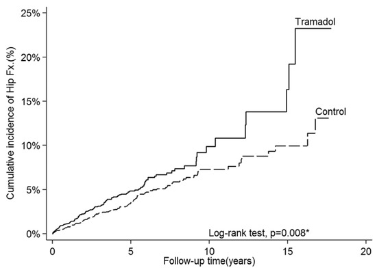 Cumulative hip fracture incidence was estimated using the Kaplan–Meier method, and a log-rank test was used to compare the incidence curves. * p < 0.05 was considered statistically significant.