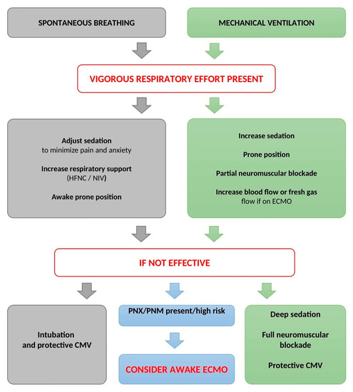 Extracorporeal membrane oxygenation (ECMO). It is essential to mention that the beneficial effects of ECMO rather lie in facilitating lung rest and healing than in acting as a modality of lung treatment per se. Extracorporeal oxygenation and elimination of carbon dioxide could significantly reduce the patient’s respiratory drive and, therefore, reduce the risk of excessive respiratory effort in spontaneously breathing patients [74,75]. An “awake ECMO approach” is based on the implantation of venovenous ECMO in spontaneously breathing patients to avoid undesirable effects associated with mechanical ventilation and continuous deep sedation. Avoiding mechanical ventilation could be advantageous, especially in patients at high risk of pneumothorax or pneumomediastinum [76,77,78].