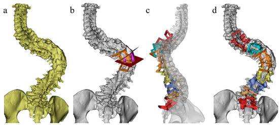 Design of osteotomy guidance templates. (a) Three-dimensional construction of spine; (b) design of osteotomy plane; (c) design of screw trajectory and guidance templates, making the osteotomy guide rail overlap with the osteotomy plane; (d) osteotomy and screw insertion guidance templates.