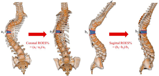 The ratio of osteotomy execution and simulation (ROES, %) was described as the coronal and sagittal part, which means the coronal/sagittal cobb angle of the osteotomy segment divided by the cobb angle of the osteotomy segment (Figure 6). In addition, surgical outcomes at the last follow-up were defined as excellent, good, fair, or poor according to the modified MacNab criteria. Complications such as nerve root injury, spinal cord injury, and cerebrospinal fluid (CSF) leakage were recorded and analyzed.