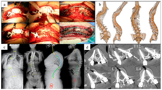 In VCR osteotomy cases, an anterior fusion is performed with a titanium cage as structural support to prevent too much shortening of the spinal column. The resected gap is then gradually compressed by repeated manual compression and shortening of the convex side. The final rods are fixed after obtaining an optimal curvature, and the satellite rod and cross-link are connected if necessary (Figure 5j).