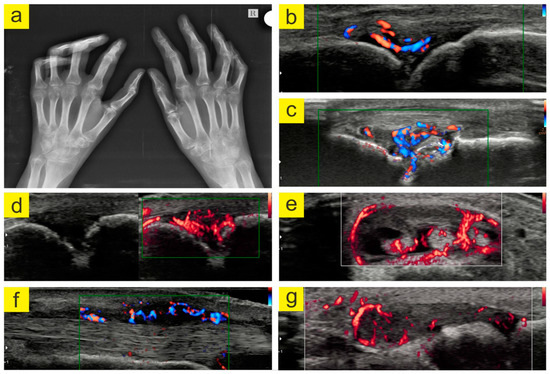 (a). Bilateral AP hand radiography. Radiological imaging identified multiple marginal erosions; narrowing of the proximal and distal interphalangeal, metacarpophalangeal, carpo-metacarpal, and carpal bone joints in both hands; osteoporosis in the band; subluxation proximal interphalangeal II, III, IV, and V of the left hand; proximal interphalangeal IV and V of the right hand, and metacarpophalangeal IV and V of the right hand. (b). Hyper vascular synovial pannus (directional power Doppler). (c). Synovial pannus and bone erosion (directional power Doppler). (d). Hyper vascular synovial pannus (microvascular flow). (e). Tenosynovitis extensor tendons of the fingers (microvascular flow). (f). Synovial pannus radial extensor of the carpus and ulnar extensor of the carpus. (g). Synovial pannus at the MTF I joint level (microvascular flow). (Images archive of the first author).