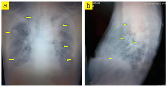 Chest radiography. (a). PA lung grapy. (b). Lateral lung grapy. Yellow arrows indicate the problem areas. (Images archive of the first author).