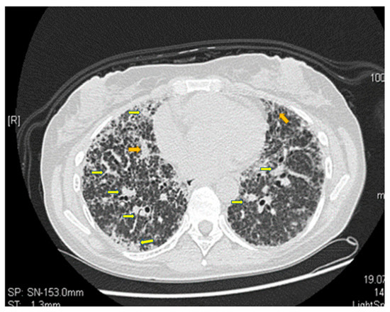 Infrahilar axial section. Polymorphous bilateral pulmonary appearance with marked augmentation with thickening of irregularly shaped interstitial septa and local pulmonary tractions. Yellow arrows indicate the problem areas. (Computed tomography scan of the lungs from the archive of the first author).
