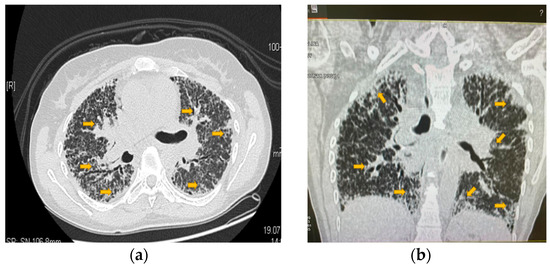 Highly accentuated bilaterally symmetric reticulo-micronodular peri broncho vascular interstitium with marked thickening of the interlobular septa and ground-glass images in the context of pulmonary lymphangitis and extensive pulmonary fibrosis changes. (a): Section in the floor of the pulmonary hilum; (b): reconstruction through the floor of the pulmonary hilum. Yellow arrows indicate the problem areas. (Computed tomography scan of the lungs from the archive of the first author).