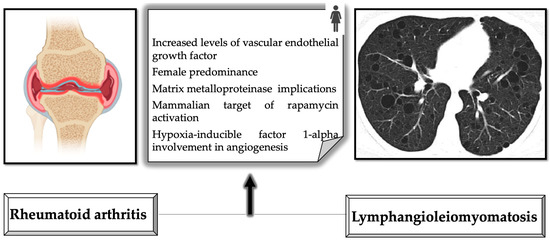 Several potential mechanisms may explain the full implications of the association between RA and LAM, two pathologies without a fully acknowledged pathophysiological mechanism. RA and LAM are both linked to abnormal immune system activation [31,32]. In addition, chronic inflammation and oxidative stress may play a role in the development of both RA and LAM.