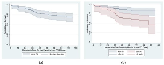 The Kaplan–Meier curve for the MFS is shown in Figure 1a. The analysis of Cox proportional hazard models demonstrated that cT was the only significant predictor of MFS among baseline clinical characteristics (Table 3), with the median MFS in patients with baseline cT ≥ 2c being significantly shorter than in the remaining patients (92 months vs. not reached; 5 year MFS: 63% (95% CI: 45–76%) vs. 86% (95% CI: 72–93%); p = 0.003; Figure 1b).