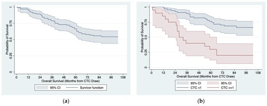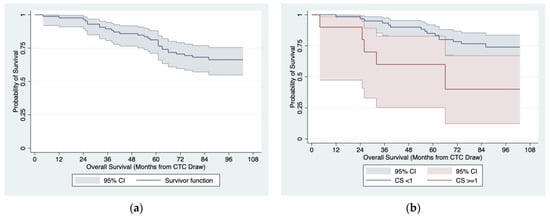 OS estimates in 85 patients with localized PCa at baseline: (a) entire cohort; (b) by baseline CTC count ≥ 1 determined with the CellSearch® system.