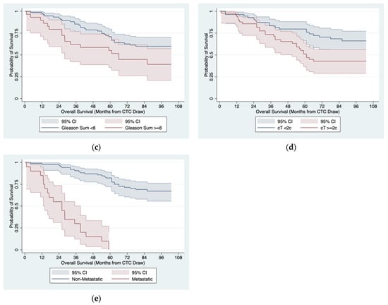 OS estimates in 104 high-risk PCa patients: (a) entire cohort; (b) by baseline CTC count ≥ 1 determined with the CellSearch® system; (c) by baseline Gleason sum; (d) by baseline cT status; (e) by the presence of metastases at the baseline.