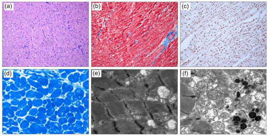 The patient underwent heart transplantation at the age of 26 months. In sibling A.III.2, genetic diagnosis after birth revealed the same variant. He was regularly seen in the outpatient clinic and was asymptomatic with normal echocardiographic finding until the age of 13 years. He deteriorated rapidly within six months and received a heart transplant. Histological findings of this patient are provided in Figure 1. Histological analysis of left ventricular tissue from the explanted heart revealed a cardiomyopathy with moderate cellular hypertrophy, in addition to increased variation of cardiomyocytes and mild myocardial fibrosis. A disarrangement of myofibril architecture and sarcomere structure was present, with irregularity of the intercalated disks. Mitochondrial aggregation of swollen and dissolved mitochondria was observed with some unspecific lipofuscin deposits. In a third male sibling (A.III.1), the pathogenic TNNT2 variant was also detected. He is seen for regular cardiac follow-ups and has no clinical or echocardiographic signs of CM at the age of five years (pedigree in Figure 2).