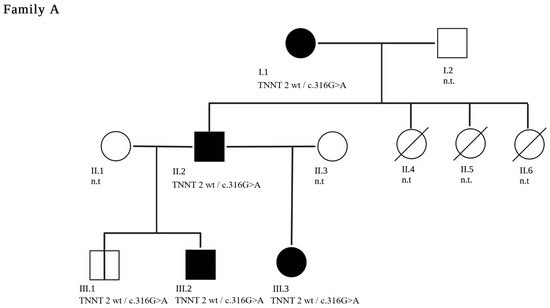 A three-generation family tree of family A is shown. The index patient is A.III.3. The clinically affected patients are marked in black. Patients A.II.4, A.II.5 and A.II.6 are deceased. The c.316G>A pathogenic variant in TNNT2 segregated with disease in the genotyped individuals. Family members who have not been genetically tested are labelled n.t—“not tested”.