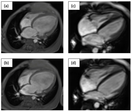 Depicted are systolic (a,c) and diastolic (b,d) MRI four-chamber views of the 17-month-old child (C.II.1) before (a,b) and 10 years after PAB (c,d) in systole and diastole.