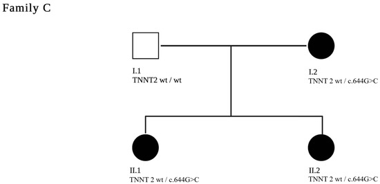 A two-generation pedigree of family C is shown. The index patient is C.II.1. The clinically affected patients are marked in black. The c.644G>C pathogenic variant in TNNT2 segregated with disease in the genotyped individuals.