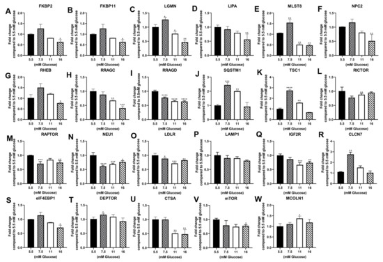 Expression of lysosomal and mTOR genes in RPTEC/TERT1 cells treated with 5.5 mM, 7.5 mM, 11 mM and 16 mM glucose for 3 passages. RT-qPCR analysis of (A) FKBP2; (B) FKBP11; (C) LGMN; (D) LIPA; (E) MLST8; (F) NPC2; (G) RHEB; (H) RRAGC; (I) RRAGD; (J) SQSTM1; (K) TSC1; (L) RIC; (M) RAP; (N) NEU1; (O) LDLR; (P) LAMP1; (Q) IGF2R; (R) CLCN7; (S) eIF4EBP1; (T) DEPTOR; (U) CTSA; (V) mTOR; (W) MCOLN1. ****; ***; **; * indicate significant differences in gene expression level compared to the 1.0 control 5.5 mM glucose concentration at p-value of ≤0.0001; ≤0.001; ≤0.01; ≤0.05, respectively.