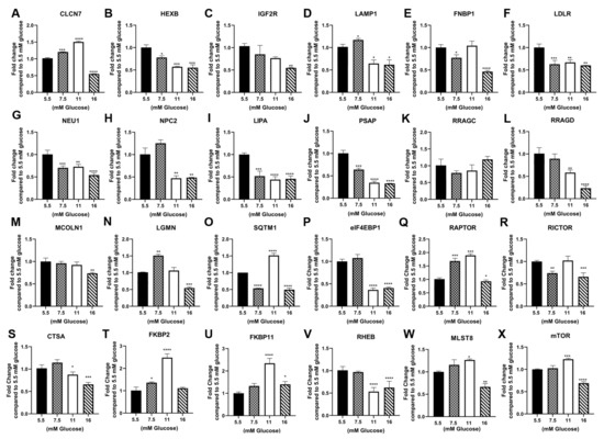 Expression of lysosomal and mTOR genes in HREC24T cells treated with 5.5 mM, 7.5 mM, 11 mM and 16 mM glucose for 7 passages. RT-qPCR analysis of (A) CLCN7; (B) HEXB; (C) IGF2R; (D) LAMP1; (E) FNBP1; (F) LDLR; (G) NEU1; (H) NPC2; (I) LIPA; (J) PSAP; (K) RRAGC; (L) RRAGD (M) MCOLN1; (N) LGMN; (O) SQTM1; (P) elF4EBP1; (Q) RAPTOR; (R) RICTOR; (S) CTSA; (T) FKBP2; (U) FKBP11; (V) RHEB; (W) MLST8; (X) mTOR. ****; ***; **; * indicate significant differences in gene expression level compared to the 1.0 control 5.5 mM glucose concentration at p-value of ≤0.0001; ≤0.001; ≤0.01; ≤0.05, respectively.