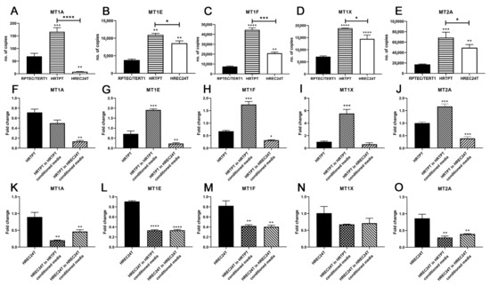 Expression of metallothionein genes in HRTPT and HREC24T cells exposed to conditioned media. RT-qPCR analysis of (A) MT1A, (B) MT1E, (C) MT1F, (D) MT1X, (E) MT2A in RPTEC/TERT1, HRTPT and HREC24T cells; (F) MT1A, (G) MT1E, (H) MT1F, (I) MT1X, (J) MT2A, in HRTPT control, HRTPT exposed to conditioned media from HRTPT, and HREC24T cells exposed to conditioned media from HREC24T; (K) MT1A, (L) MT1E, (M) MT1F, (N) MT1X, (O) MT2A in HREC24T control, HRTPT exposed to conditioned media from HREC24T and HREC24T cells exposed to conditioned media from HREC24T. ****; ***; **; * indicate significant differences in copy number and gene expression level compared to the control either RPTEC/TERT1 or HRTPT or HREC24T at p-value of ≤0.0001; ≤0.001; ≤0.01; ≤0.05, respectively.