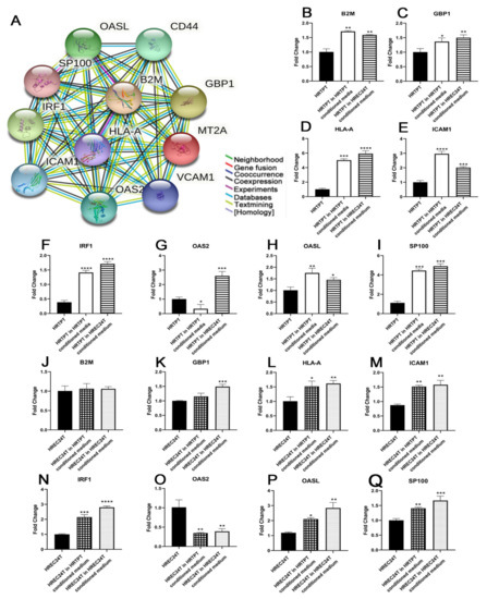 Expression of MT2A associated genes in HRTPT and HREC24T cells exposed to conditioned media. (A) MT2A showed numerous protein–protein associations, and the top 10 genes with highest string-db score were OAS2, OASL, HLA-A, SP100, B2M, CD44, GBP1, VCAM1, ICAM1, and IRF1. RT-qPCR analysis of (B) B2M; (C) GBP1; (D) HLA-A; (E) ICAM1; (F) IRF1; (G) OAS2; (H) OASL; (I) SP100 in HRTPT control, HRTPT exposed to conditioned media from HRTPT and HREC24T cells exposed to conditioned media from HREC24T; (J) B2M; (K) GBP1; (L) HLA-A; (M) ICAM1; (N) IRF1; (O) OAS2; (P) OASL; (Q) SP100 in HREC24T control, HRTPT exposed to conditioned media from HREC24T and HREC24T cells exposed to conditioned media from HREC24T. ****; ***; **; * indicate significant differences in gene expression level compared to the control either HRTPT or HREC24T at p-value of ≤0.0001; ≤0.001; ≤0.01; ≤0.05, respectively.