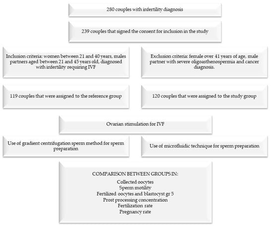 Exclusion criteria were: females over 41 years of age, and a male partner with severe oligoasthenospermia and cancer diagnosis. Enrollment lasted from 1 January 2022 until 31 December 2022. We chose the age of 41 as the upper limit of inclusion in the study because up to this age, we performed ovarian stimulation and obtained embryos with each woman’s genetic material (own oocytes). After this age, we offer them the possibility of donated oocytes. However, we know that the rate of aneuploidy after 38 years is higher, and we offer the possibility of genetic testing of the embryos. During this timeframe, 280 patients were eligible to participate, and 239 signed the consent form for participation. They were randomized in a 1:1 ratio to standard sperm processing or microfluidic sperm preparation, resulting in 119 subjects undergoing sperm processing with density gradient (control group) and 120 microfluidic sperm preparation, ZyMot (study group). All the patients required IVF and the etiology of infertility was various, and they all had ICSI cycles.