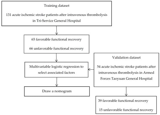 In this study, we collected retrospective data from 131 AIS patients who received intravenous thrombolysis treatment without contraindications within 3 h of stroke symptom onset from 1 January 2011 to 31 December 2015, in the Tri-Service General Hospital according to the Taiwan Stroke Association guidelines (no hemorrhagic stroke by brain computer tomography, onset of AIS was less than 3 h and excluded milder (NIHSS score < 4) contraindications). The validation dataset was collected by an emergency physician (C-G Cheng) from patients enrolled during the same period in Taoyuan Armed Forces General Hospital. The flowchart of this study is shown in Figure 1. The Tri-Service General Hospital is a tertiary medical center, and Taoyuan Armed Forces General Hospital is a community hospital in northern Taiwan. The study was approved by the Institutional Review Board of the Tri-Service General Hospital (Ethical Application Ref: TSGHIRB-2-106-05-116).
