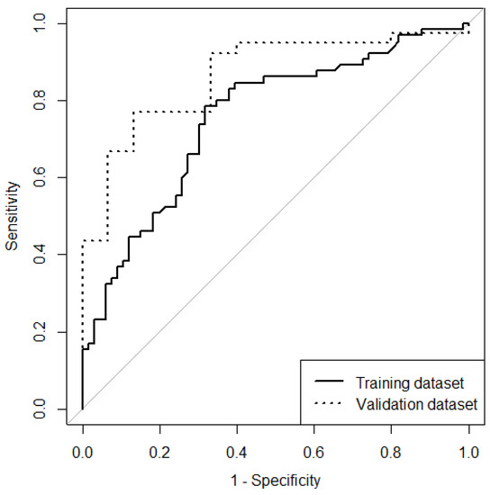 Receiver operating characteristic curve of the training and validation datasets.