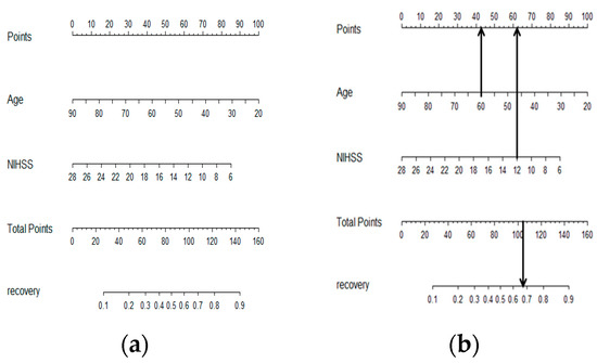 (a) Nomogram for functional recovery probability after intravenous thrombolysis. (b) Nomogram application of recovery probability before thrombolysis. A line was drawn straight upward with an up arrow to obtain the points for the variables. For example, a patient aged 60 years (43 points) had an NIHSS score of 12 (62 points). The total point score was the sum of age and NIHSS scores with 105. Drawing a straight line downward from total points 105 to the lowest line then corresponds to an estimated recovery probability of 67%.