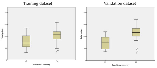 A study in England found increased intracranial hemorrhage and mortality in patients admitted to the emergency department by ambulance; indeed, the urgent care of AIS patients is a challenging task [18]. Female sex, normal blood glucose, and no cortical involvement are associated with major neurological improvements [19]. The hemorrhage after thrombolysis (HAT) score showed that patients who were older than 80 years and had a stroke area encompassing more than 1/3 of the middle cerebral artery territory were more likely to experience brain hemorrhage after thrombolysis [20]. When AIS occurs in patients older than 80 years with a stroke area encompassing more than 1/3 of the middle cerebral artery territory, intravenous thrombolysis is not recommended based on the guidelines of the Taiwan Stroke Association [21]. Patients who are recommended to receive intravenous thrombolysis according to this guideline seem to have a lower risk of brain hemorrhage. However, a previous study revealed a twofold increase in the brain hemorrhage risk after intravenous thrombolysis in an Asian cohort [22]. Furthermore, in the TTT-AIS study, more hemorrhage occurrences were reported in thrombolysis patients older than 70 years (odds ratio: 4.12) [23]. Our study found that age was related to recovery from intravenous thrombolysis. If patients suffering from a decline in the Glasgow Coma Scale score undergo brain imaging to check for intracranial hemorrhage, the time may lag several days. The patients with AIS suffering from any type of intracranial hemorrhage after intravenous thrombolysis had more unfavorable functional recovery in the training dataset (39.4% vs. 4.6%, p < 0.001), which was classified as poor recovery.