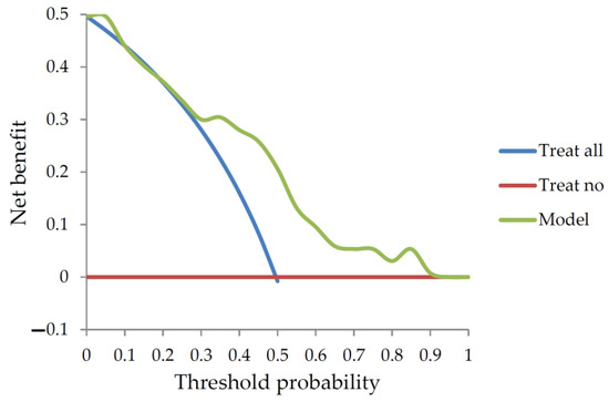 We selected an mRS ≤ 2 after 3 months of follow-up after treatment as a cutoff point; the ability of a patient to walk without support is indicative of a good quality of life. The median NIHSS was 15 among patients in the training dataset with a higher stroke severity, but these data points allowed for a better understanding of the impact of the stroke severity on the outcome. External validation was performed using a new independent dataset from a different institution, which allowed valuation of the utility and the applicability of the developed model [17]. The clinical net benefit was 0.21 in the threshold probability of 0.5 using decision curve analysis as shown in Figure 5.