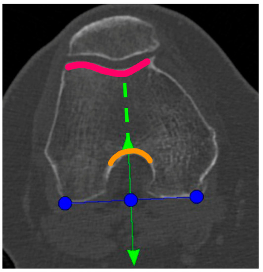 Blue line: tibial rotation landmark co-aligned to the posterior femoral condylar line. Green line: perpendicular to the blue line and centered to the middle of the notch (anterior green arrow and orange curved line) and the trochlea groove (green dotted line and pink curved line).