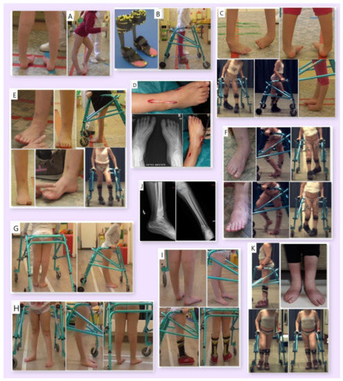 Images of the patient: at first access to the rehabilitation unit ((A), age 75 months); AFOs and walker ((B), age 76 months); pre-surgery ((C), age 88 months); intraoperative ((D), age 91 months); 4 and 9 months after surgery, respectively ((E), age 96 months; (F), age 100 months); pre-botulinum toxin injection ((G), age 104 months); 1 month after botulinum toxin injection ((H), age 105 months); 4 months after botulinum toxin injection ((I), age 109 months); left tibial fracture ((J), age 111 months); last assessment ((K), age 121 months).