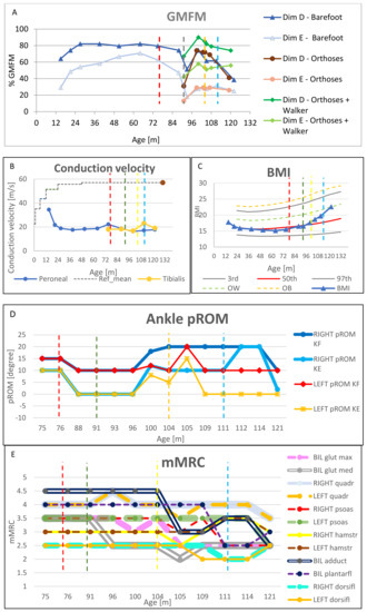 Clinical and instrumental assessments performed over the follow-up period, at different months of age. Time at which interventions and fracture occurred is represented with vertical dot lines: respectively, AFO in red, surgery in green, botulinum in yellow, and tibial fracture in light blue. (A): Gross Motor Function-88 (GMFM-88) dimensions D and E, in different conditions: barefoot, with orthoses, with orthoses and walker. (B): Conduction velocity relative to the right leg. (C): BMI of the patient, with Italian growth norms for females [14], related to the 3rd, 50th, and 97th percentile and extra-centiles for overweight (OW) and obesity (OB). (D): Lower limb passive range of motion (pROM), according to Modified Tardieu Scale: slow pROM to assess muscle stiffness and contractures, fast pROM to assess spastic reaction (which identified the range at which the catch was evoked). (E): Lower limb strength assessment by means of modified Medical Research Council (mMRC) scale.