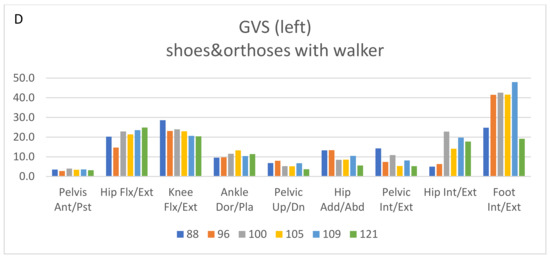 Four months after BTX-A, a clinical examination (Figure 2D,E), GMFM (Figure 2A), and another 3DGA (Figure 3A–D) were performed. The limitation in the left passive dorsiflexion recurred to 10° at KF and 0° at KE. No change in pROM was detected on the right. Strength partially recovered, but the left foot continued to be supinated during standing and walking.