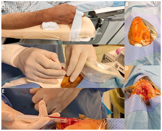 The patient’s forearm is positioned in a neutral semi-pronated position (A) and a drape is placed over the hand after it is prepped, exposing the anatomical snuff box (B). Arterial puncture of the distal radial artery is performed with a 21-gauge micro-puncture needle under ultrasound guidance (C). The wire is advanced through the needle in the vessel in a retrograde fashion (D). If there is any resistance in passing the wire further in the forearm, further imaging with fluoroscopy and angiography is performed (E).