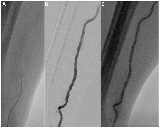 - Minici, R.; Ammendola, M.; Talarico, M.; Luposella, M.; Minici, M.; Ciranni, S.; Guzzardi, G.; Laganà, D. Endovascular Recanalization of Chronic Total Occlusions of the Native Superficial Femoral Artery after Failed Femoropopliteal Bypass in Patients with Critical Limb Ischemia. CVIR Endovasc. 2021, 4, 68. [Google Scholar] [CrossRef]
