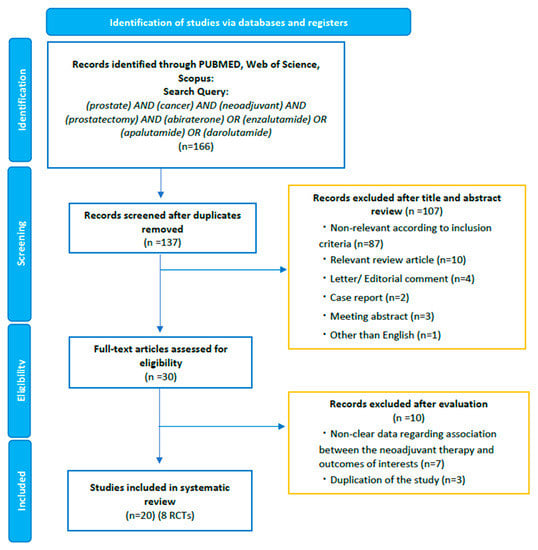 Our initial search identified 166 records. After removing duplicates, 137 records remained for screening titles and abstracts (Figure 1). After the screening, a full-text review of 30 articles was performed. According to our inclusion criteria, we finally identified 20 studies eligible for systematic review [,,,,,,,,,,,,,,,,,,,]. Of the twenty studies, we identified eight phase II RCTs comparing the efficacy and/or safety of ARSI-based combination therapy versus other combinations or ADT/ARSI alone (Table 1) [,,,,,,,]. We consolidated the current evidence with a focus on phase II RCTs. However, despite RCTs, inclusion criteria, treatment regimen, duration, and the definition of MRD differed across RCTs; therefore, we did not perform a pooled analysis or meta-analysis.