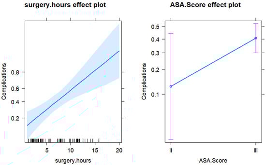 Effect plots for the surgery hours and ASA score from the final logistic regression model for the risk of complications.