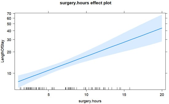 Effect plot for the length of surgery in hours prediction from the final Gamma regression model for the length of stay response.