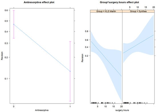 As we can see from Figure 3, the effect of surgery time was the opposite in the two KLS® and Depuy Synthes® groups. In the KLS Martin® group, with every additional one hour increase in the surgery time, the risk of revisions decreased by around 20% (OR = 0.81), having the antiresorptive medication group fixed. For the Depuy Synthes® group, with every additional one hour increase in the surgery time, the risk of revisions increased by around 11% (OR = 0.81 × 1.37 = 1.11), having the antiresorptive medication group fixed. The antiresorptive medication group had a smaller risk of revision by 83% (OR = 0.17), as compared to the group without this medication, having the group variable and the time of surgery fixed (the same).
